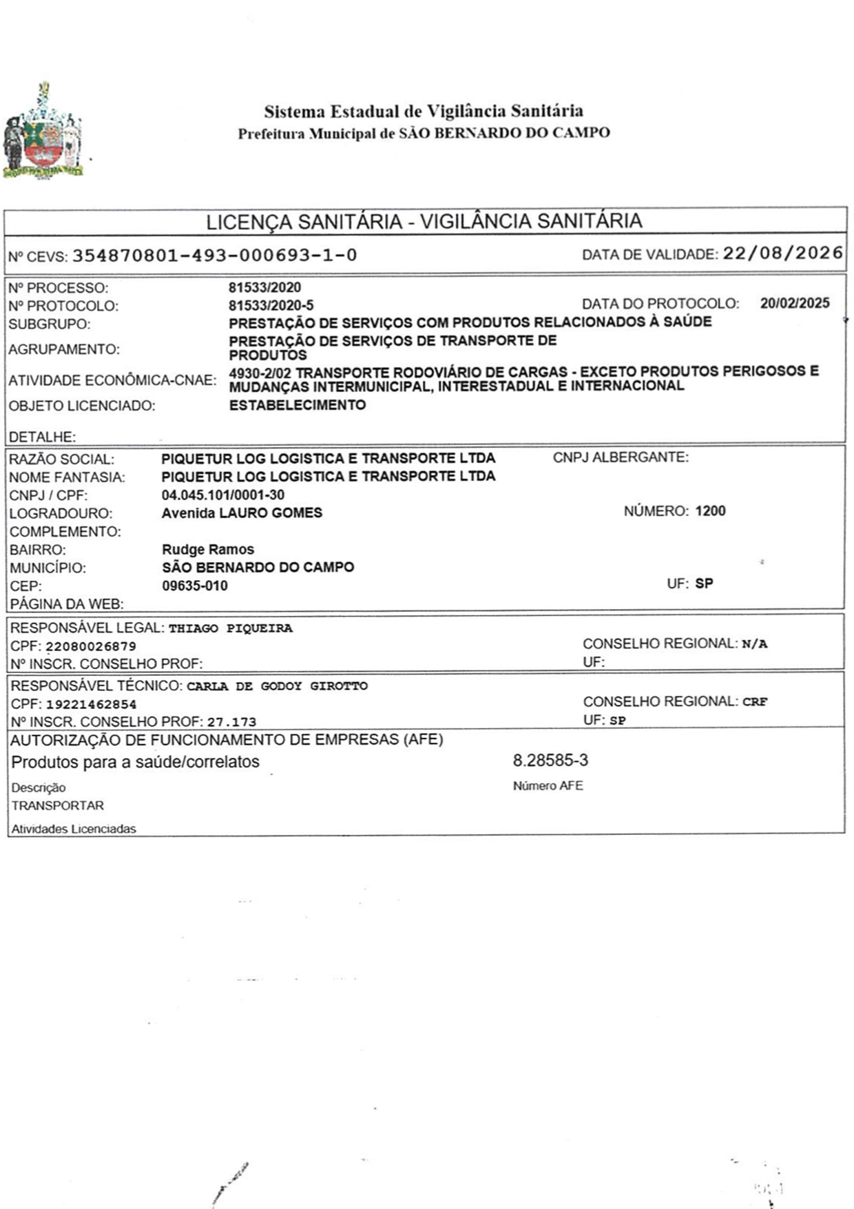 Certificações ISO 9001 : 2015 Licença Sanitária Certificação AFE 701Transporte de Medicamentos Certificação AFE 862Produtos para Saúde Certificado Exército